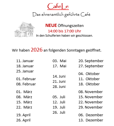 Wir freuen uns auf ein lebendiges Treiben im CafeLe und natürlich auch bei unseren Veranstaltungen. Zu denen es immer auch leckere hausgemachte Suppen oder Eintöpfe gibt - immer 1 Stunde vor Veranstaltungsbeginn.